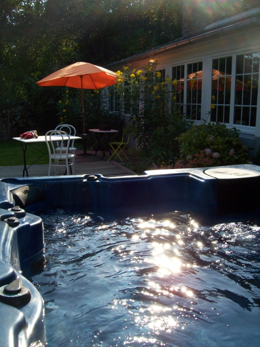 Terrasse avec barbecue, tables et chaises de jardin, parasol et JACUZZI-SPA